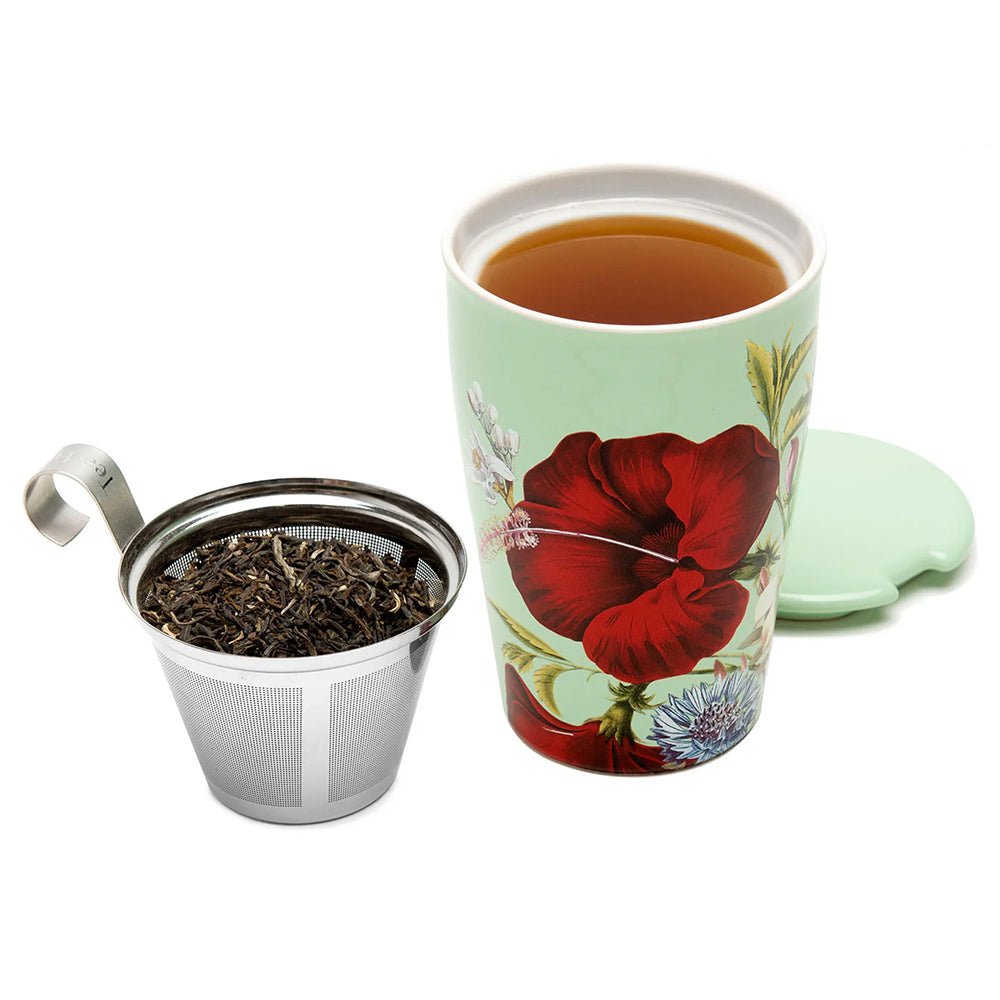 - Includes stainless steel infuser basket, ceramic cup & lid