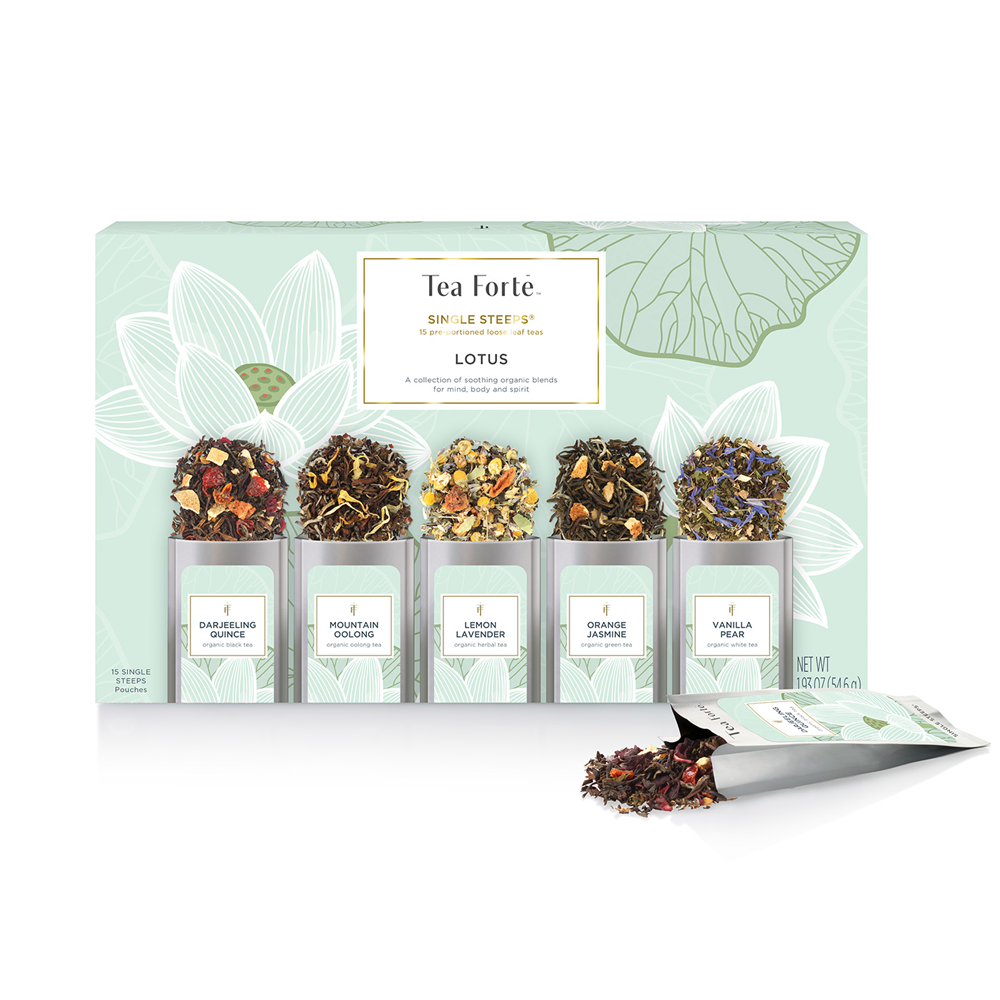Lotus Single Steeps® is a curated collection of relaxing teas for mind, body & spirit. This unique and unprecedented gourmet collection of highest-grade, small-lot, certified organic teas have been difficult to source as they are rarely exported. Each box contains fifteen pre-measured loose tea pouches, 3 of each blend: Darjeeling Quince, Lemon Lavender, Mountain Oolong, Orange Jasmine, and Vanilla Pear. All teas are USDA Organic Certified. See below for blend descriptions.